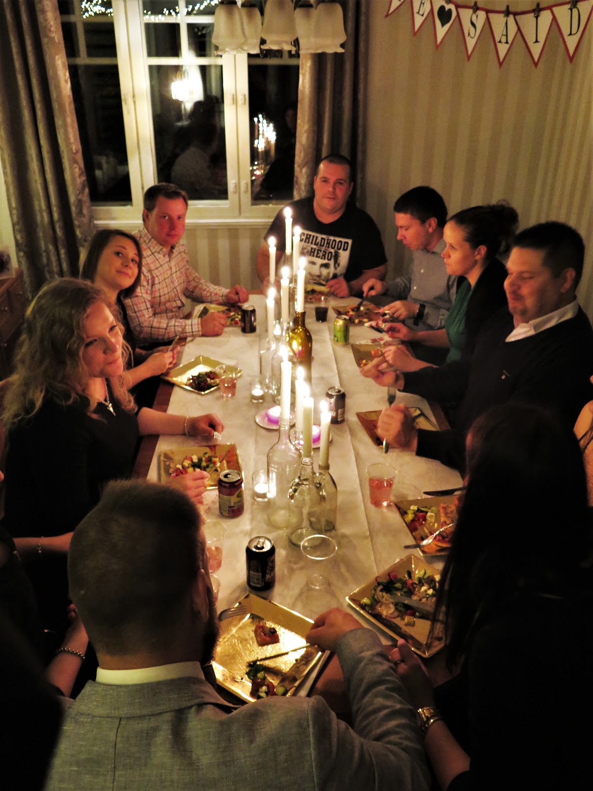 Helgen efter förlovningskaffet var det då dags för vår förlovningsfest. Det var denna fest som vi satsade järnet på eftersom vi bjöd kompisar från båda sidor och ville ha ordentligt med mat och dryck, pynt och livemusik. Både Kiko och jag är ju erkända partyprissar så konstigt vore det annars. Och visst kände man lite press att leverera också! Men festen blev ju precis så där bra som jag hade hoppats och jag tror, ähh vet, att våra vänner var nöjda också. Det är ju inte alltid det lättaste att slå ihop två stora gäng men här funkade det ändå riktigt bra och en del kände varandra sen tidigare. Vi behövde inte hyra något ställe när vi fick låna mitt barndomshem så istället bjöd vi återigen på hembakt pizza med sallad och till kaffet salted caramel cheesecake och mini cupcakes med banan, choklad och galliano. Sen hade vi obegränsat med dryck och nattmat i form av hotdogs och snacks förstås. Ett för oss fungerande upplägg. Tusen tack till alla som hjälpt till före, under och efter festen. Det var vi alla tillsammans som gjorde festen till en så minnesvärd kväll < 3 Det var ett kalas riktigt i Kikos och min anda, vilka fina vänner vi har som ville fira med oss! Och tack till lillebror och Thomas för underbar musik, det lyfte verkligen feelisen. (En del bilder här nedan har jag snott av mina vänner, minns inte vem så nu får ni leva med det.) Och tusen tack för alla gåvor!